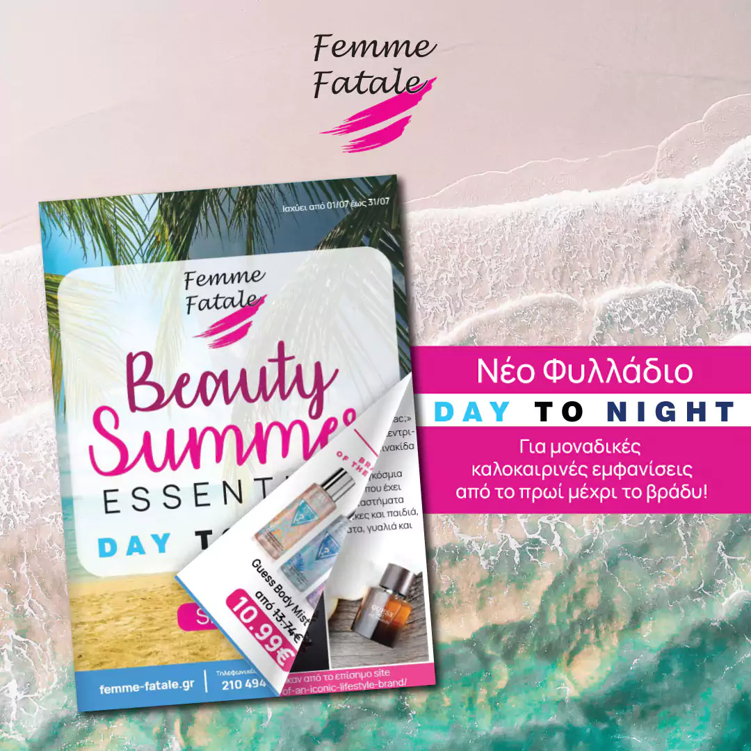 Ξεφύλλισε το Νέο Φυλλάδιο του 𝐅𝐞𝐦𝐦𝐞 𝐅𝐚𝐭𝐚𝐥𝐞 & βρες τα 𝐦𝐮𝐬𝐭 𝐡𝐚𝐯𝐞 προϊόντα Ομορφιάς για Μοναδικές Καλοκαιρινές Εμφανίσεις από το πρωί μέχρι το βράδυ!