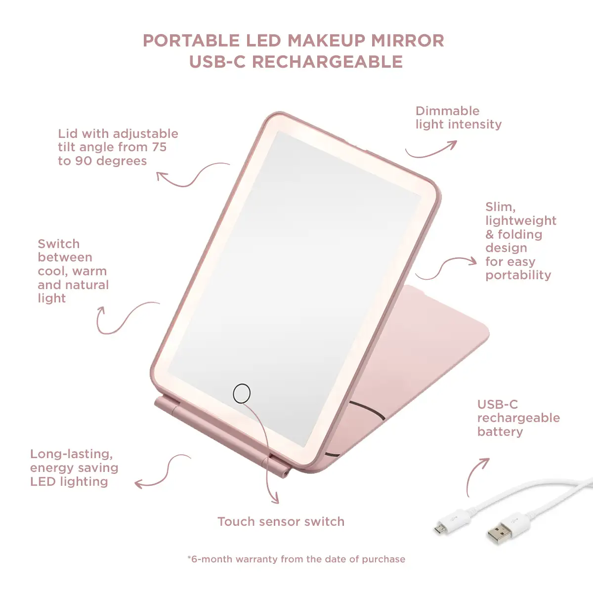 • Η θύρα USB-C στο πίσω μέρος του καθιστά το Mirror Mirror το απόλυτο makeup gadget καθώς μπορείς να το φορτίσεις εύκολα και γρήγορα όπου και αν βρίσκεσαι, συνδέοντας απλά το περιλαμβανόμενο στη συσκευασία καλώδιο σε οποιοδήποτε φορτιστή υπολογιστή ή κινητού.