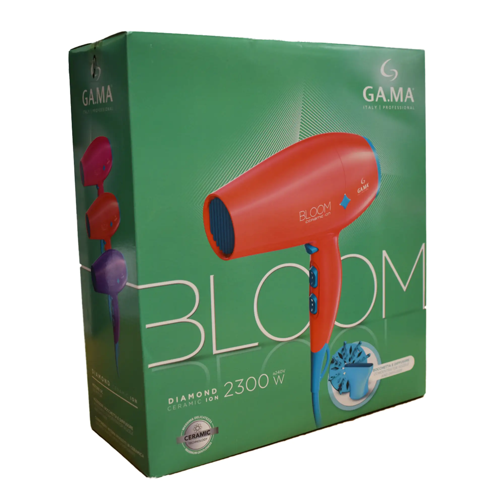 Το GAMA Diamond Bloom Ceramic Ion είναι ένα πιστολάκι μαλλιών με ισχύ 2300W, σχεδιασμένο για γρήγορο στέγνωμα και προστασία των μαλλιών. Διαθέτει αθόρυβο DC μοτέρ που παράγει ισχυρή ροή αέρα 90 m³/h και θερμαινόμενες επιφάνειες ενισχυμένες με τεχνολογία Ceramic Ion. Έτσι, υπόσχεται γρήγορο και ομοιόμορφο στέγνωμα και styling, με μαλλιά λαμπερά και υγιή, χωρίς ίχνος φριζαρίσματος! Περιλαμβάνει φυσούνα για τέλειο styling σε σγουρά ή κυματιστά μαλλιά και ενσωματώνει τεχνολογία ιόντων για προστασία από τη φθορά και τη στατική ηλεκτρική ενέργεια.