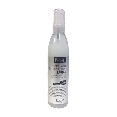 To Perfecta Instant Restitutive Spray 250ml χάρη στα θρεπτικά συστατικά του όπως η Βιταμίνη B6 σε συνδυασμό με την Κερατίνη και το θαλάσσιο κολλαγόνο είναι ιδανικό για μαλλιά βαμμένα, ταλαιπωρημένα από βαφές και πιστολάκι. Προσφέρει ενυδάτωση, προστασία, ελαστικότητα και μεταξένια λάμψη. Βοηθάει στο ξεμπέρδεμα των μαλλιών μετά το λούσιμο.