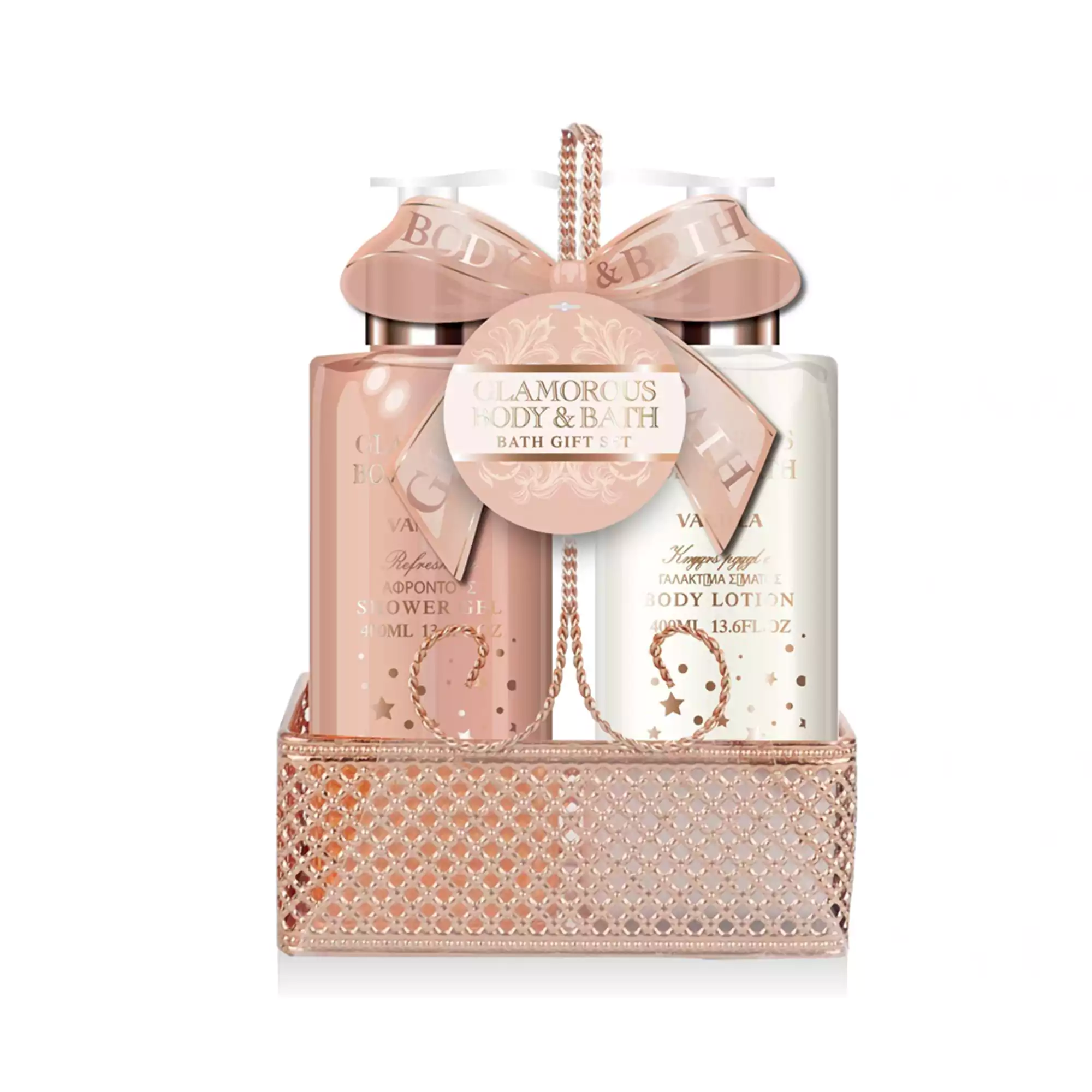 Το Glamorous Σετ Δώρου Rose Gold Metal Base περιλαμβάνει προϊόντα περιποίησης σώματος με υπέροχο άρωμα σε μεταλλική βάση καλαθάκι.