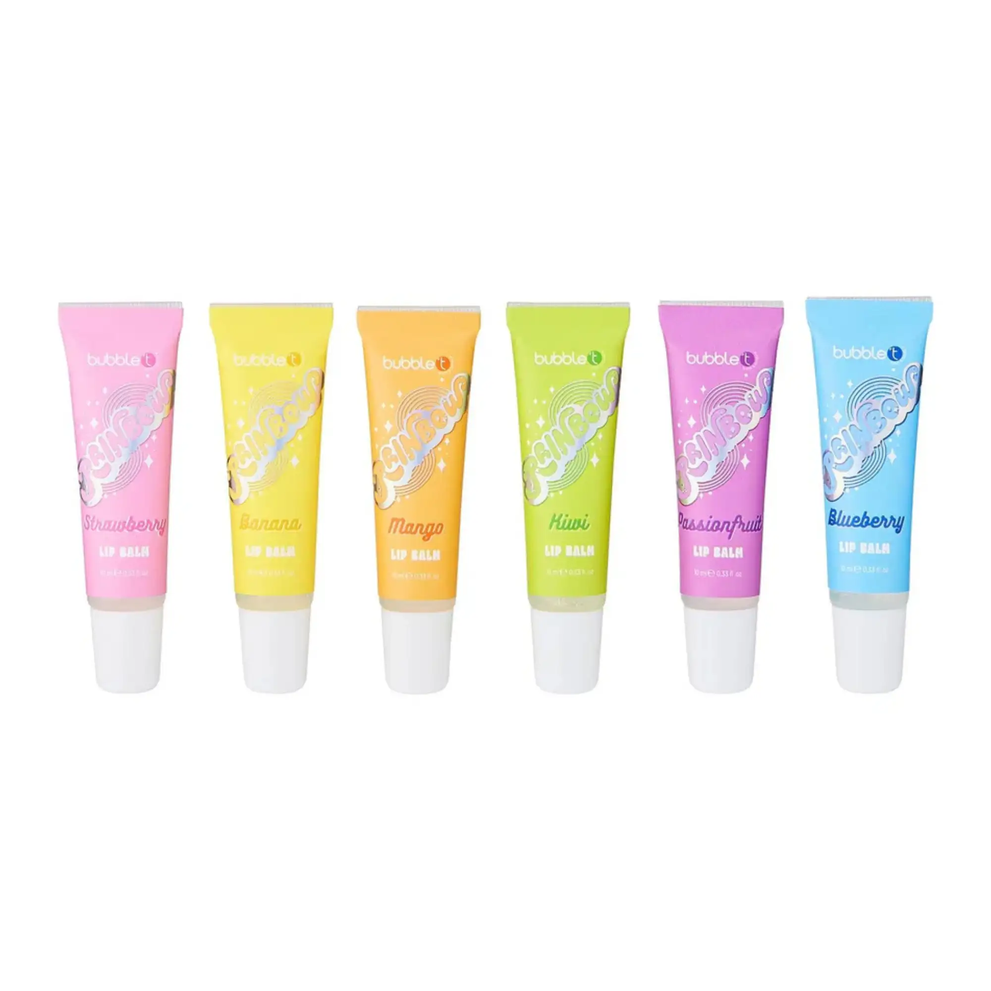 • Το Bubble-T Rainbow Lip Gift Set περιλαμβάνει έξι ενυδατικά lip balms: Strawberry, Banana, Mango, Kiwi, Passionfruit, Blueberry.