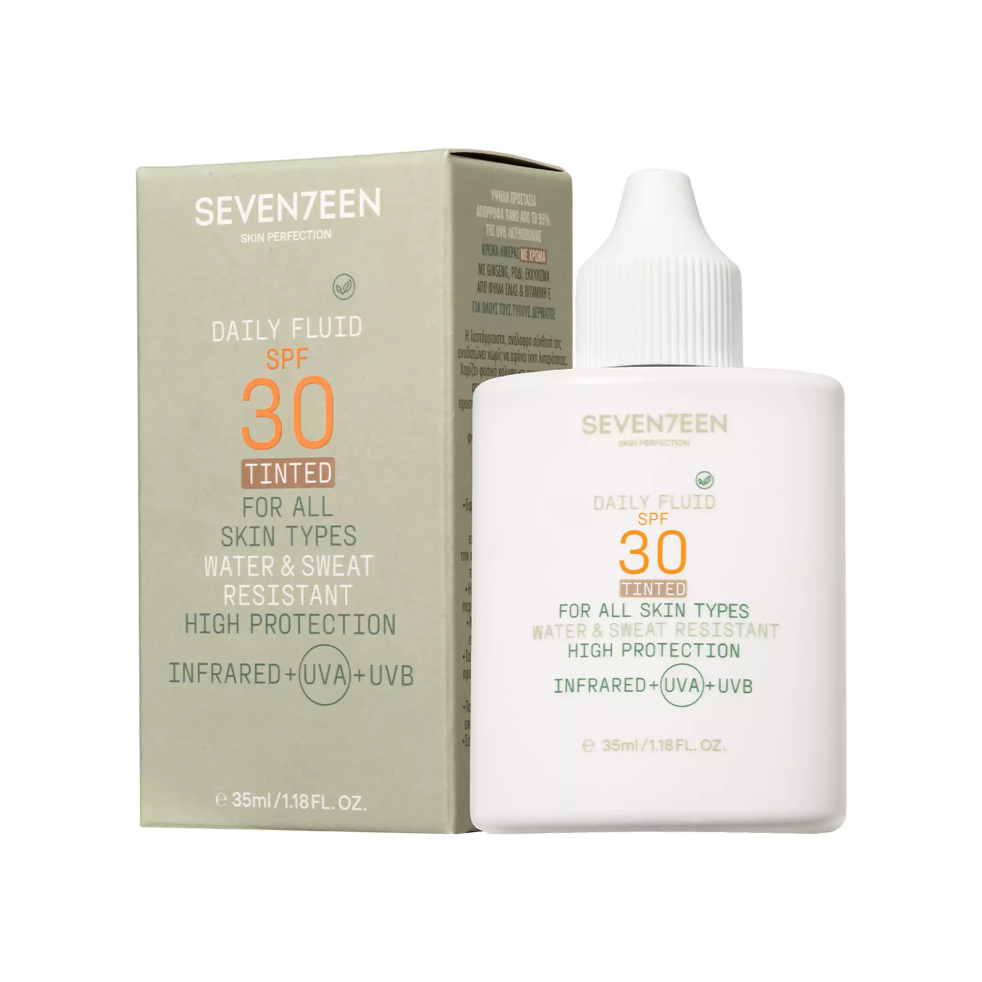 Το Seventeen Daily Fluid Tinted SPF30 35ml διατίθεται σε απλή αντηλιακή λοσιόν και με χρώμα. Είναι δερματολογικά ελεγμένο.